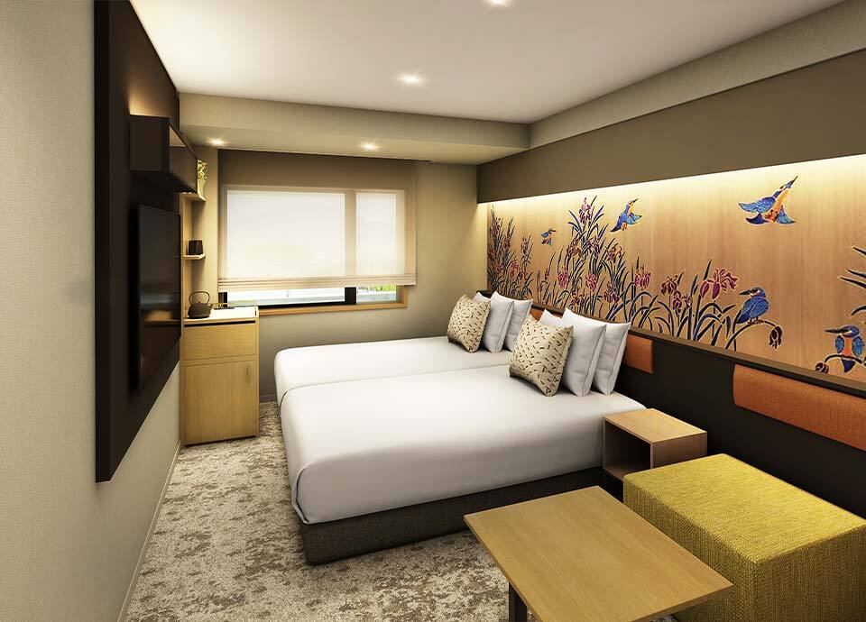 燕子花の意匠が施された、和モダンなデザインが魅力の落ち着いた空間。