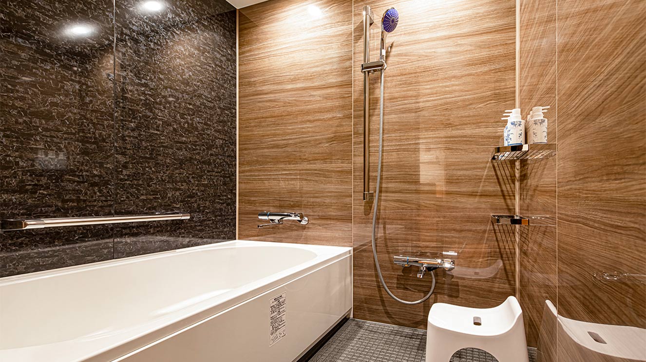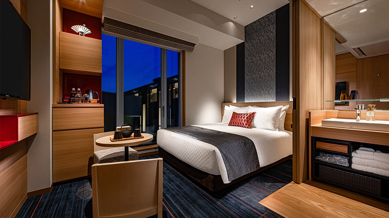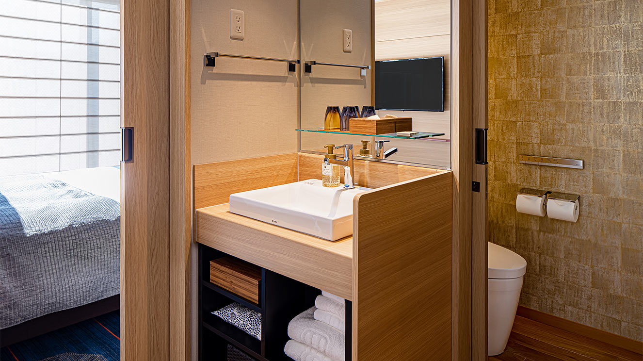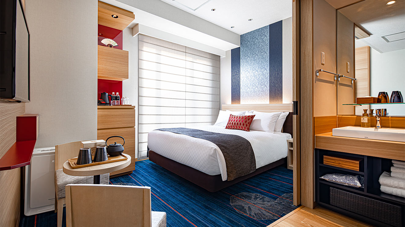 ゆったり150cm幅のベッドの他、洗い場付きのバスルームと独立洗面、独立トイレを備えた客室。落ち着いた色調が心地よい特別な空間で、ごゆっくりとお過ごしください。